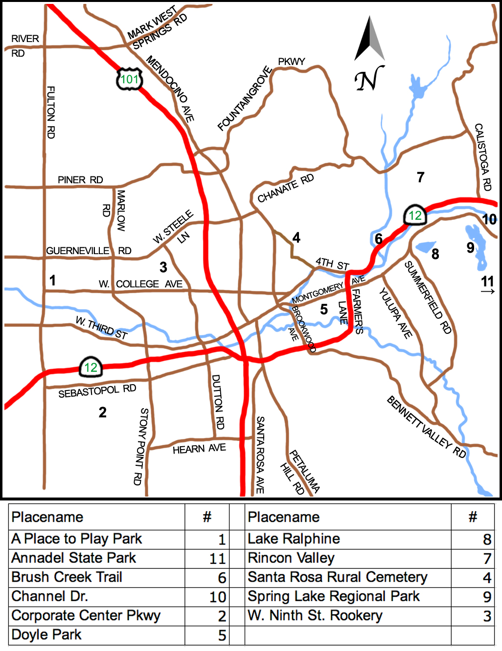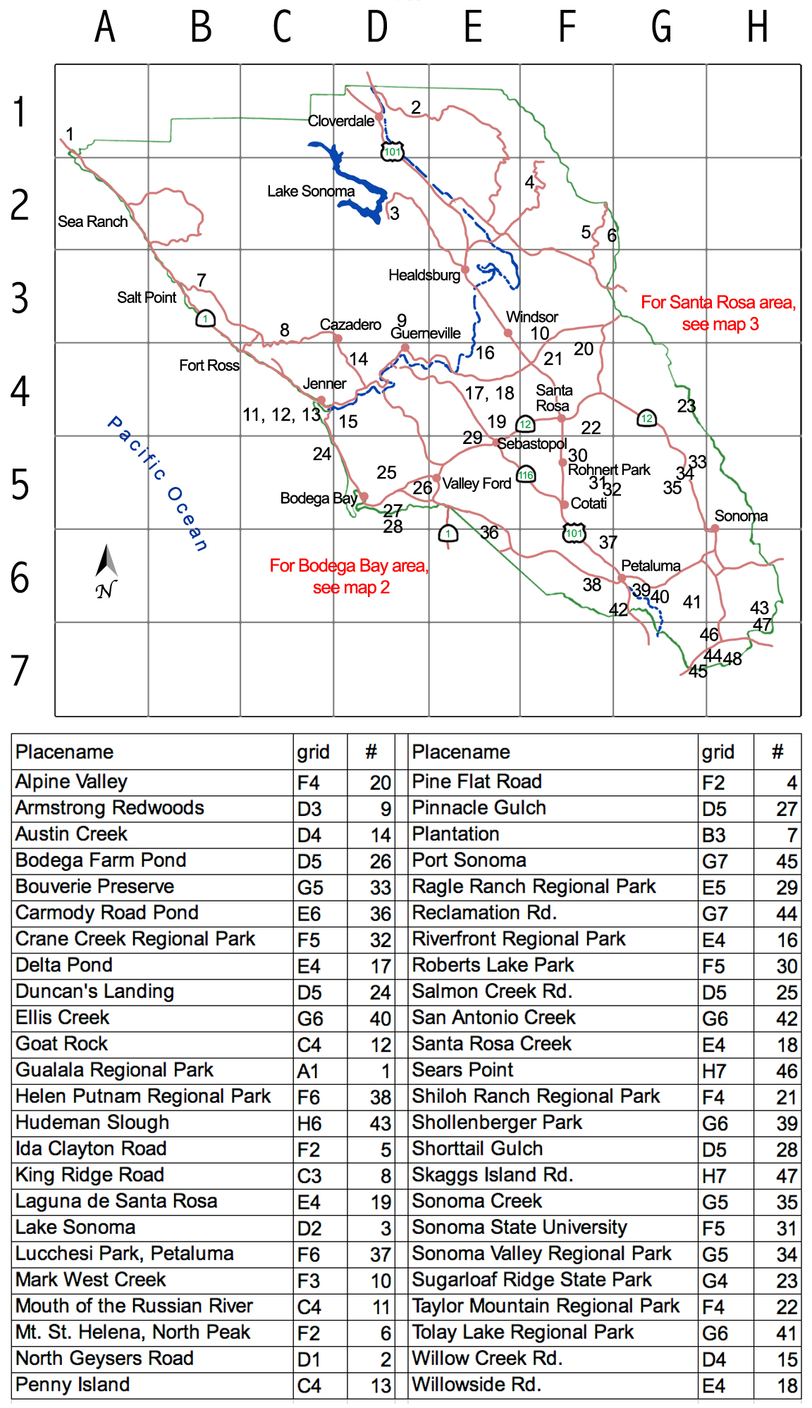 Below are birding locations, with corresponding grid numbers showing their rough location on the map. Many of these locations are visited each year on Madrone's free field trips - check the calendar for upcoming trips and directions.
